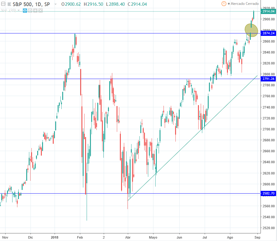 La bolsa americana vemos que sigue con su rally alcista y que en las 4 últimas sesiones experimentó un gap alcista que hizo que rompiera la resistencia de 2874 puntos. Creemos que va a seguir con esta tendencia alcista y que hará soporte en la anterior resistencia citada. Las cifras económicas de EEUU siguen sin ningún cambio sustancial y en buen cauce.