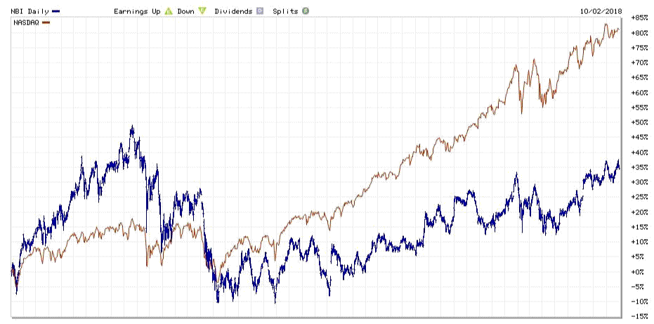 Desde el año 2013 ha habido una revalorización tal en el sector biotecnológico, que ha conseguido rentabilidades superiores al del resto del NASDAQ-100. La mayoría de las gestoras aprovecharon esta coyuntura para promocionar más estos fondos. En el año 2015 esta situación empezó a corregirse y desde el año 2016 el NASDAQ vuelve a crear más valor que el NBI.