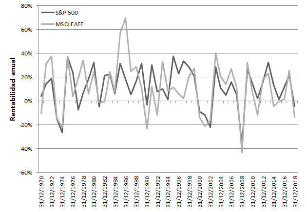 Fuentes: Global Financial Data, rentabilidad total del índice S&P 500 y rentabilidad neta del índice MSCI EAFE entre el 31/12/1969 y el 31/12/2018. La información se presenta en dólares estadounidenses, conque las fluctuaciones de los tipos de cambio entre el dólar estadounidense y el euro podrían dar rentabilidades superiores o inferiores.